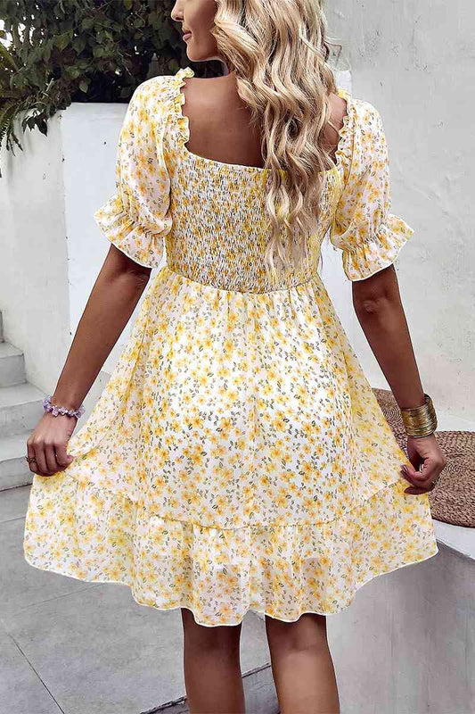 Floral Smocked Square Neck Flounce Sleeve Dress