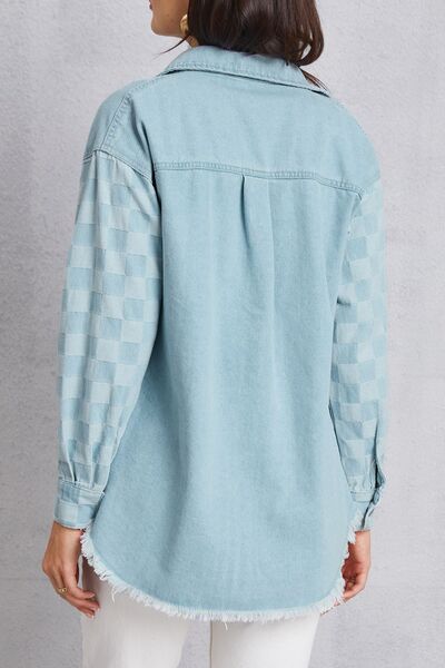 Raw Hem Checkered Dropped Shoulder Denim Jacket
