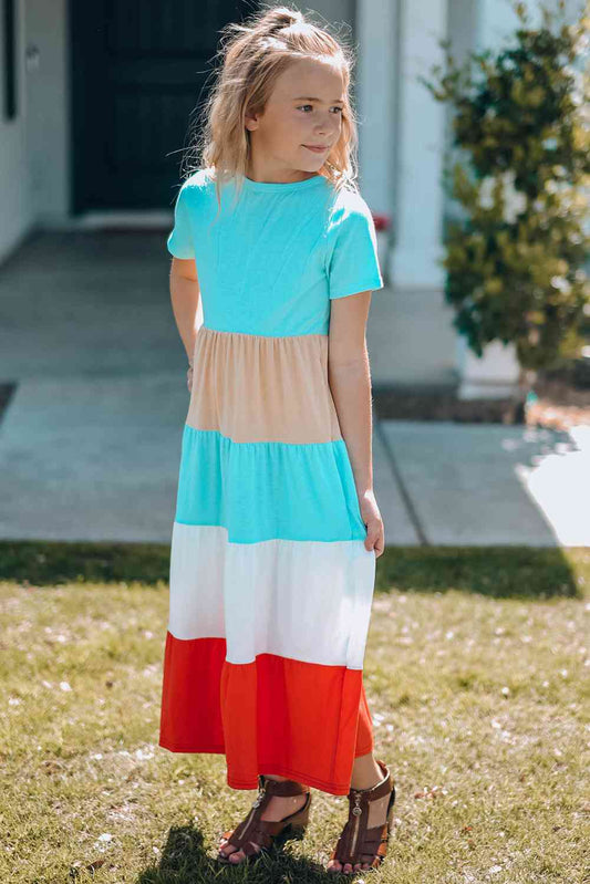 Girls Frilled Notched Neck Puff Sleeve Dress