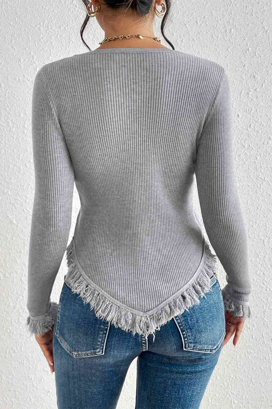 Ribbed Ruffled Round Neck Long Sleeve Knit-Top