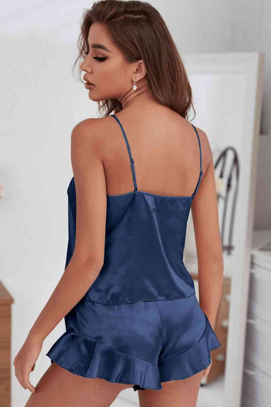 Satin Cami, Ruffle Hem Shorts Pajama Set