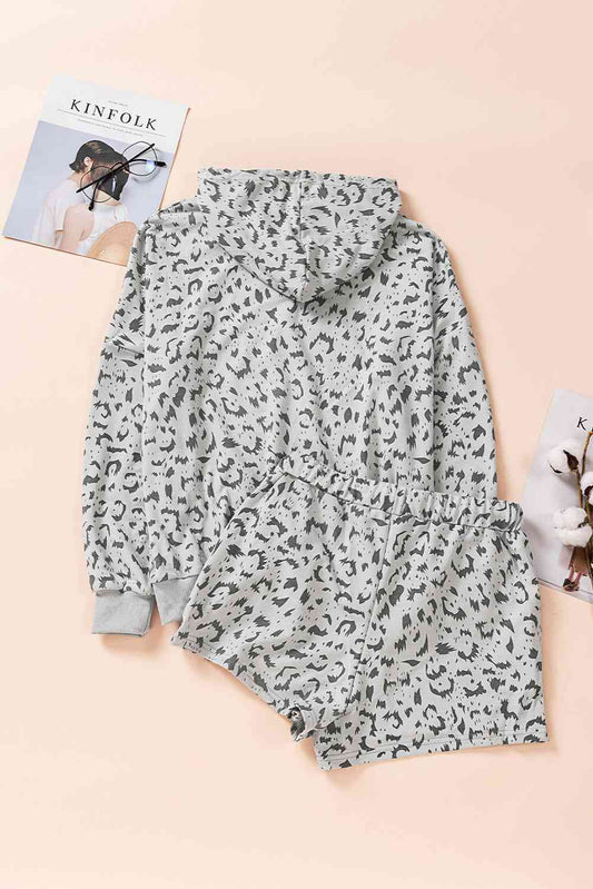 Animal Print Drawstring Detail Hoodie and Shorts Lounge Set