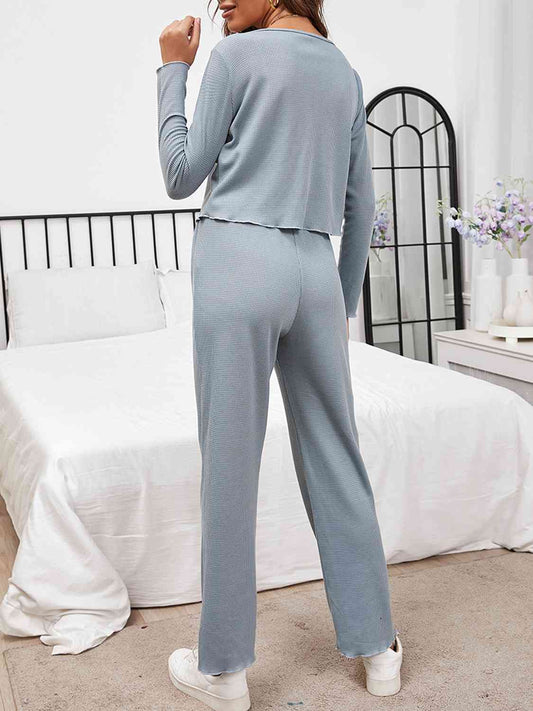 Button Front Long Sleeve Top and Pants Lounge Set
