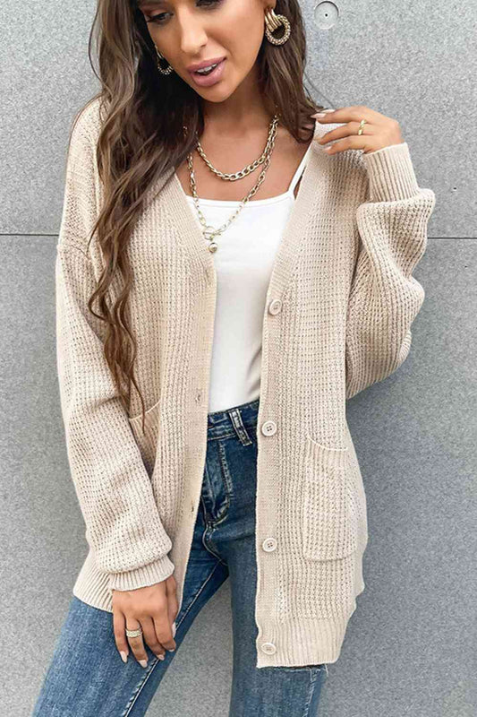 Waffle-Knit Long Sleeve Cardigan with Pocket