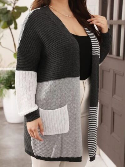 Plus Size Color Block Pocketed Dropped Shoulder Cardigan