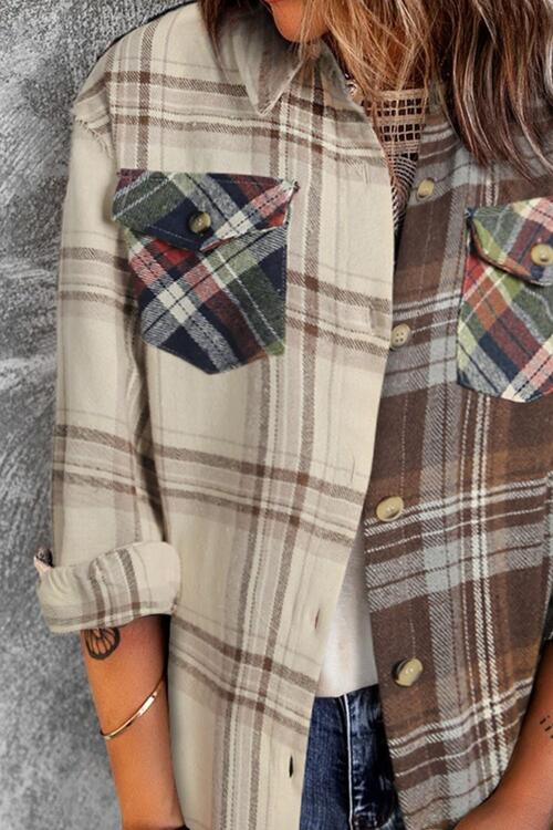 Double Take Plaid Collared Neck Long Sleeve Button-Up Shirt