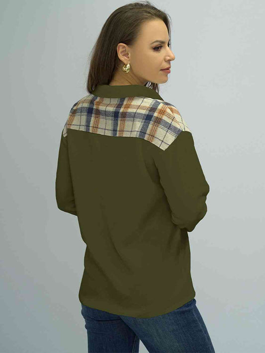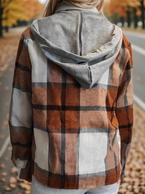 Double Take Plaid Curved Hem Shirt Jacket with Breast Pockets