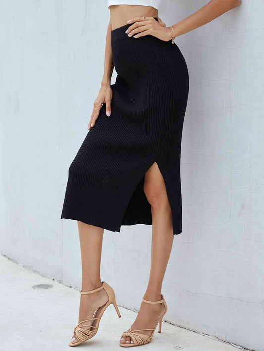 Ribbed Side Slit Midi Skirt