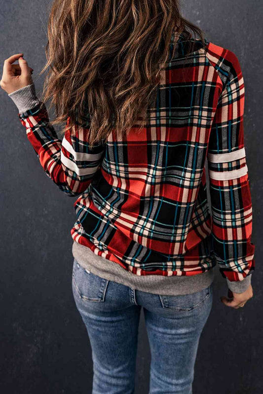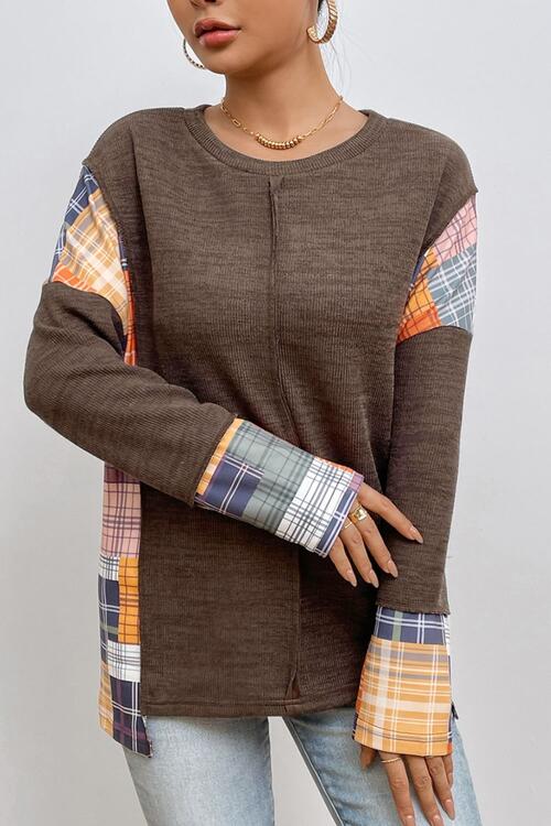 Plaid Exposed Seam Round Neck Sweatshirt