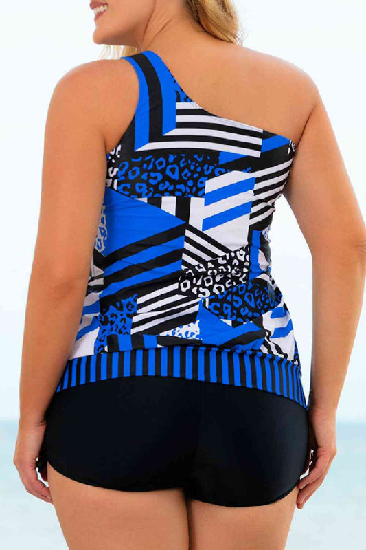 Plus Size Patchwork Tied One-Shoulder Tankini Set