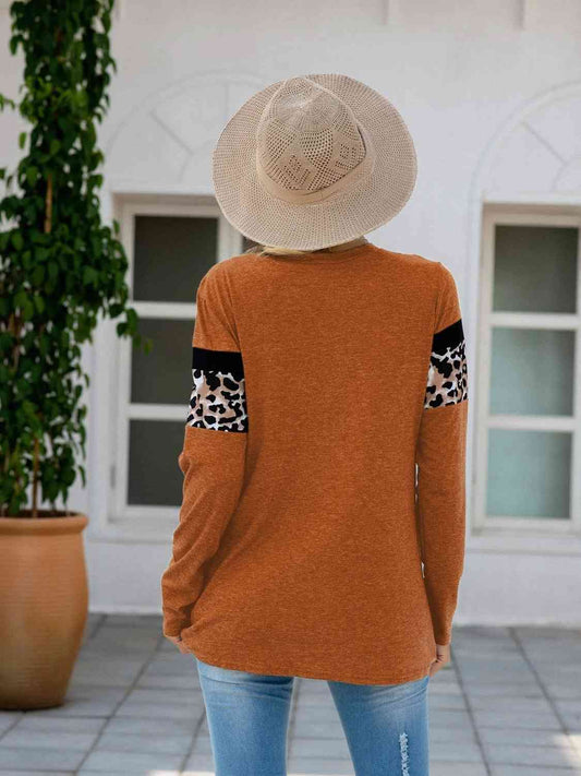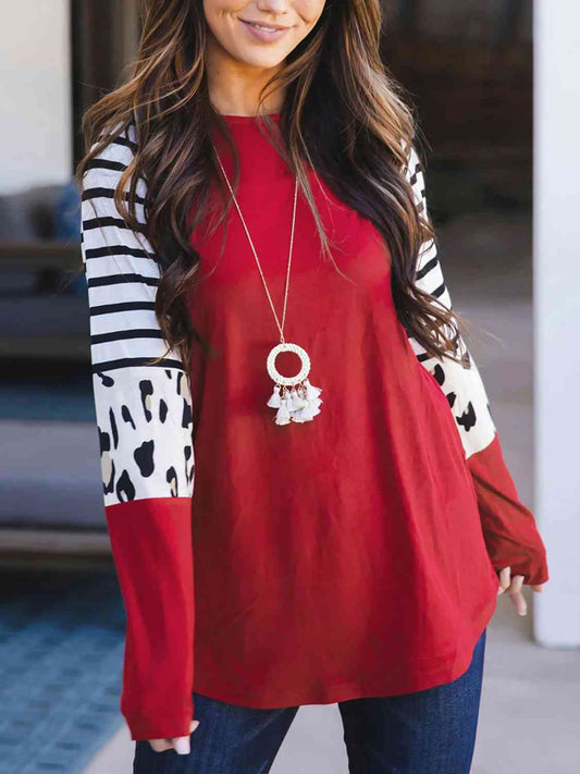 Round Neck Contrasting Color Printed Lantern Sleeve Top