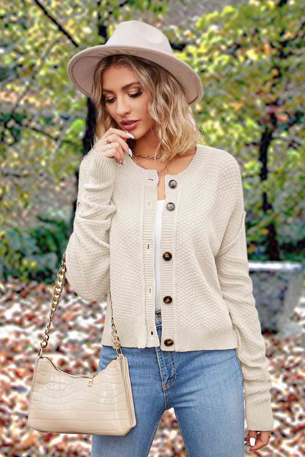Button Up Round Neck Drop Shoulder Cardigan